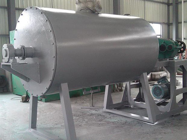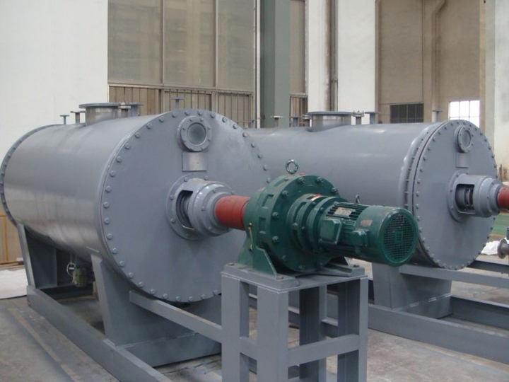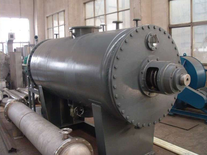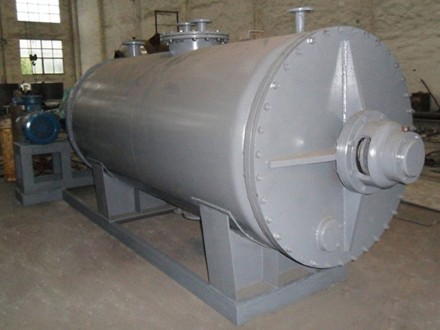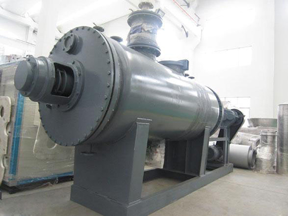 被干燥物料從殼體上方正中間加入,在不斷正反轉(zhuǎn)動的耙齒的攪拌下,物料軸向來回走動,與殼體內(nèi)壁接觸的表面不斷替換,受到蒸汽的間接加熱,耙齒的均勻攪拌,粉碎棒的粉碎,使物料內(nèi)的水份氣化,在真空系統(tǒng)的作用下,使被干燥物料內(nèi)部水份和表面水份更有利的排出,氣化的水份經(jīng)干式除塵器、濕式除塵器、冷凝器,從真空泵出口處放空。